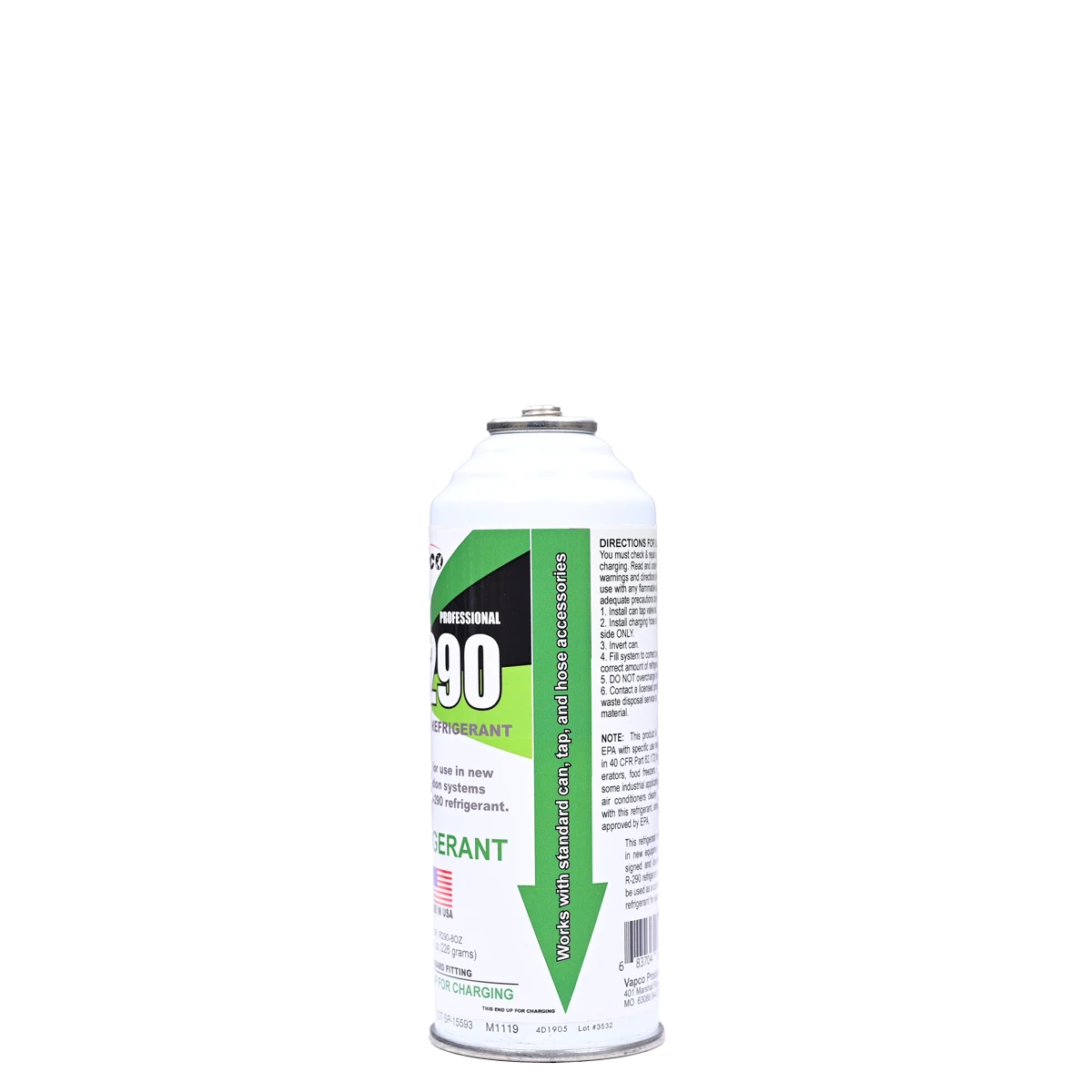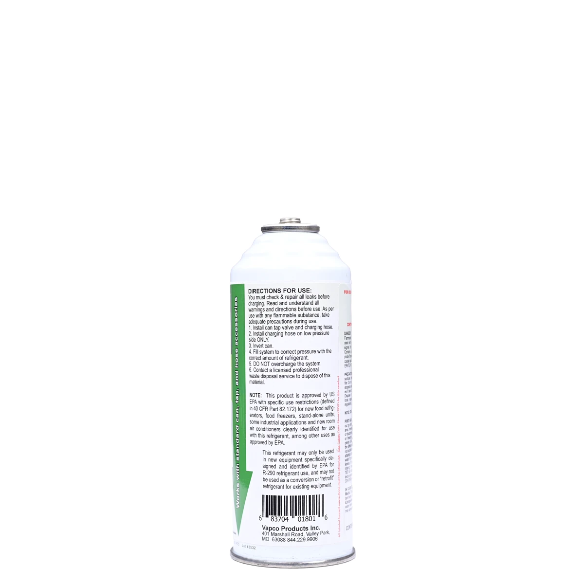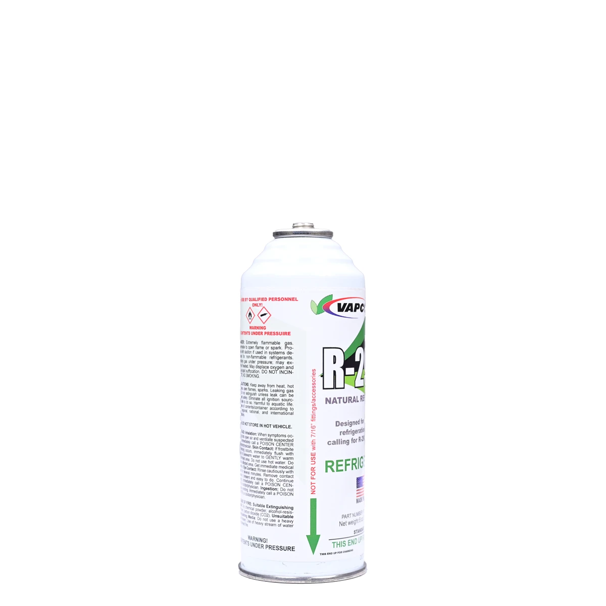 R-290 REFRIGERANT – A step into the future of refrigeration. As global regulations phase down high-GWP HFCs, our refrigerant-grade propane provides the performance and sustainability that professionals demand. Unlike blended refrigerants, our 99.5%+ pure, non-odorized R-290 ensures system integrity, avoids contamination, and delivers consistent cooling performance. It is the definitive charging solution for the latest generation of self-contained commercial and domestic systems, including reach-in coolers, freezers, ice machines, and specialty appliances. Packaged in a convenient 8 oz service can, it’s designed for precise, efficient service by certified professionals trained in handling A3 flammable refrigerants. This can features a standard 1/2″ ACME fitting for perfect compatibility within the Vapco ecosystem of service tools. For a complete and reliable solution, trust Vapco’s line of hydrocarbon-rated 1/2″ can piercing valves and charging hoses to ensure a perfect seal, precise refrigerant delivery, and professional results on Residential Refrigerators and Freezers, Wine Coolers, Beverage Centers, and Kegerators Stand-alone Ice Makers, Compact / Under-counter Refrigerators, Commercial Reach-in Coolers and Display Cases, Restaurant Prep Tables and Underbar Coolers, Portable Air Conditioners, and more.
